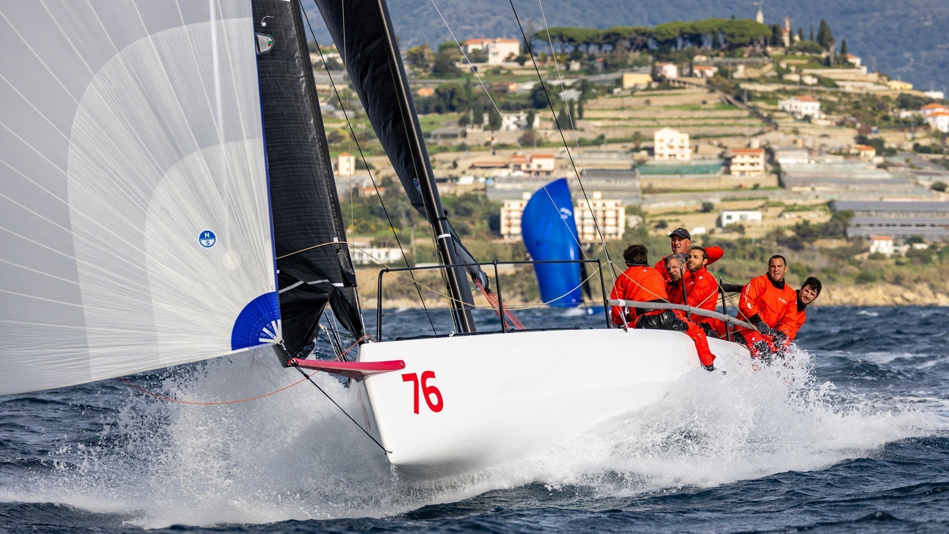 No tension. Leave the horizontal wrinkles in the luff of the mainsail – this gives you maximum fullness.