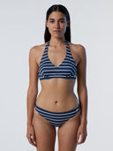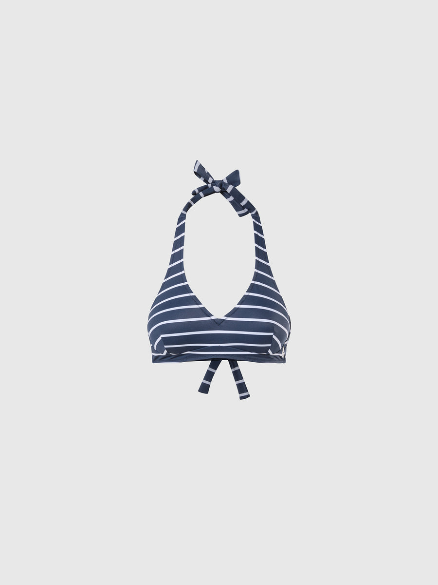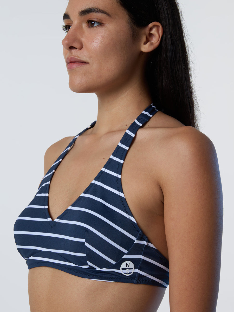 Style, support and planet-conscious spirit. Taking it back to our marine roots with a classic striped design, this halterneck bikini top is made from eco LYCRA® produced from recycled materials to help reduce the amount of waste sent to landfill. Styled with an elegant V-neckline, it features adjustable ties for a flawless fit and comes with removable padding. A rubberized North Sails logo adds a signature touch.