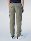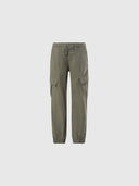 Kids' cargo pants made from stretch BCI cotton poplin, styled with a drawstring waist. Slanted patch pockets and back logo patch.