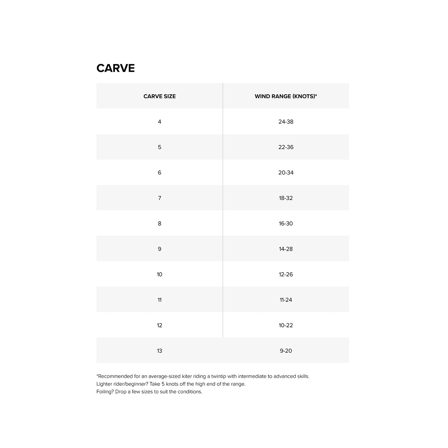The lighter the kite, the faster the steering and the more lift it creates. The Carve has lighter weight bladders in all sizes in the range.