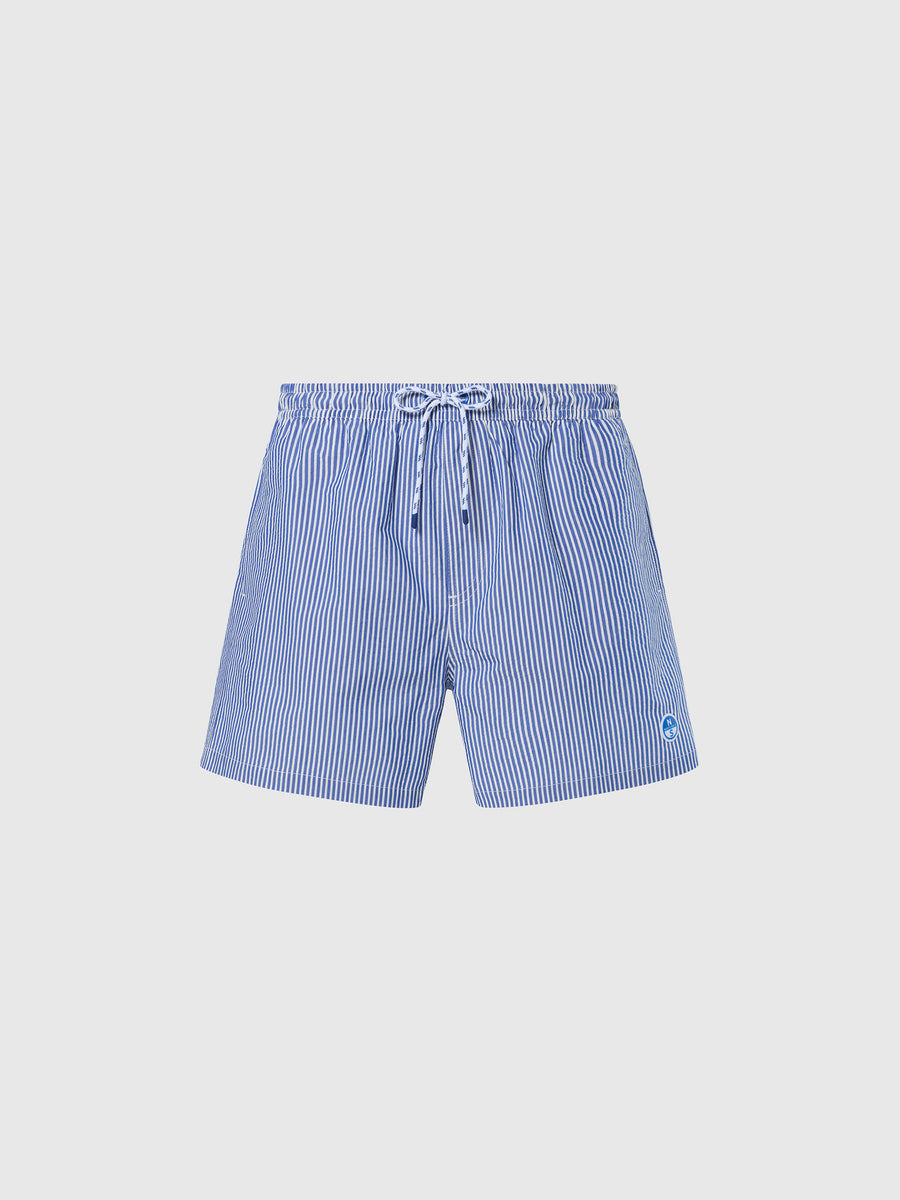 El tejido veraniego por excelencia con sus atemporales rayas. Este bañador seersucker fruncido está hecho de una mezcla de algodón y poliéster reciclado, lo que ayuda activamente a reducir la cantidad de desechos enviados a los vertederos. Se completa con un bolsillo trasero con solapa y parches clásicos con el logotipo para darle el característico toque de North Sails.